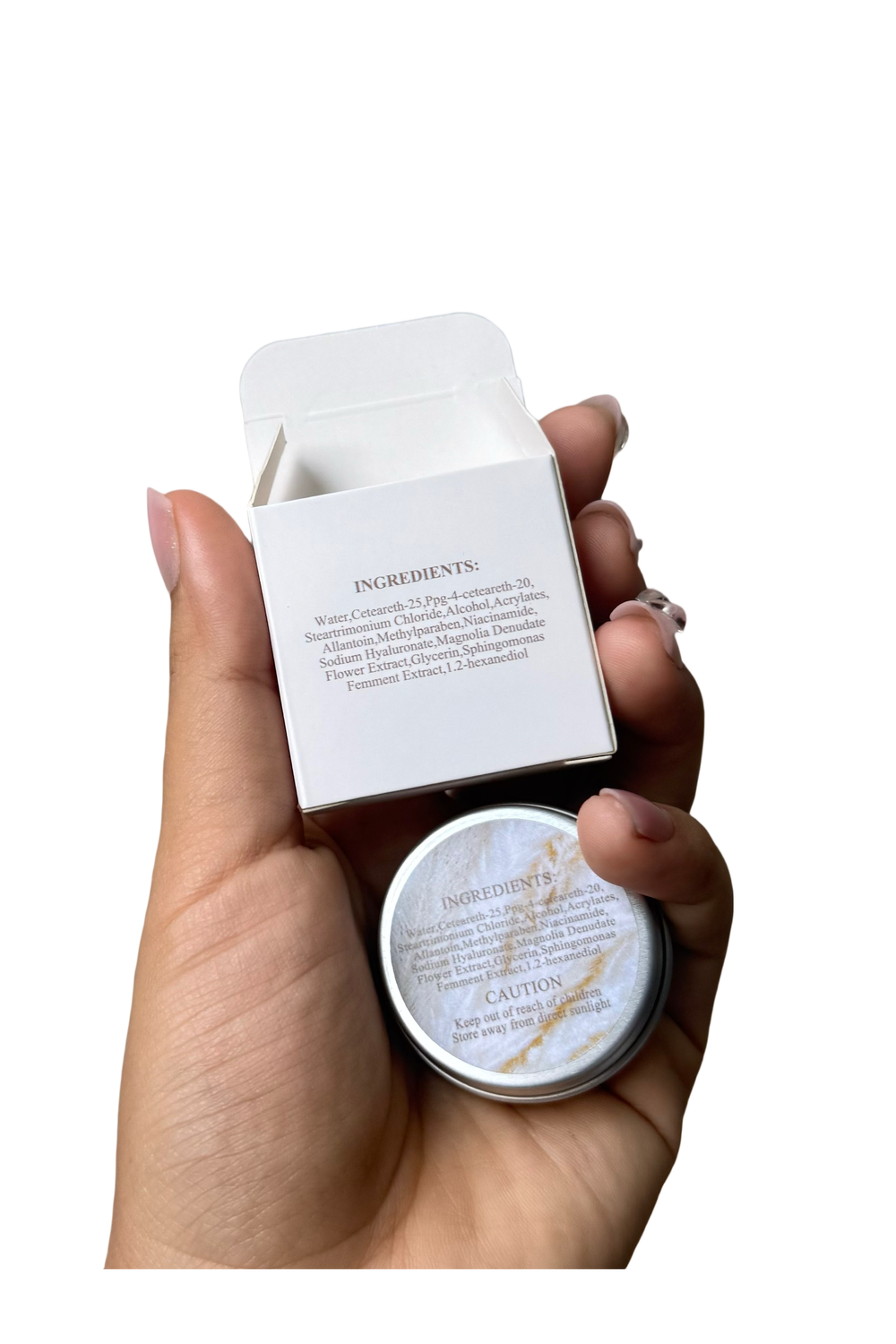 Water, Ceteareth-25, PPG-4-Ceteareth-20, Steartrimonium Chloride, Alcohol, Acrylates, Allantoin, Methylparaben, Niacinamide, Sodium Hyaluronate, Magnolia Denudata Flower Extract, Glycerin, Sphingomonas Ferment Extract, 1,2-Hexanediol